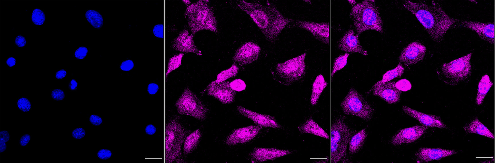 Immunocytochemical staining of C2C12 cells with PCBP2 antibody. Nuclei were stained blue with DAPI; PCBP2 was stained magenta with Alexa Fluor? 647. Images were taken using Leica stellaris 5. Protein abundance based on laser Intensity and smart gain: Medium. Scale bar, 20 μm.