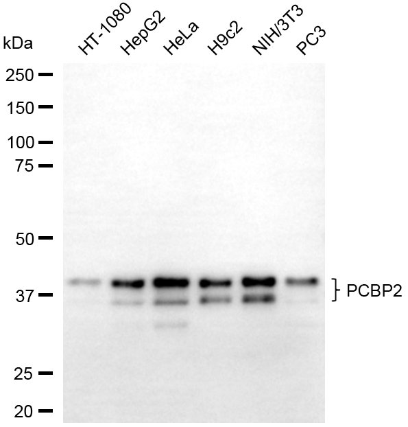 Western blotting analysis using PCBP2 antibody. Total cell lysates (30 μg) from various cell lines were loaded and separated by SDS-PAGE. The blot was incubated with PCBP2 antibody and HRP-conjugated goat anti-rabbit secondary antibody respectively.