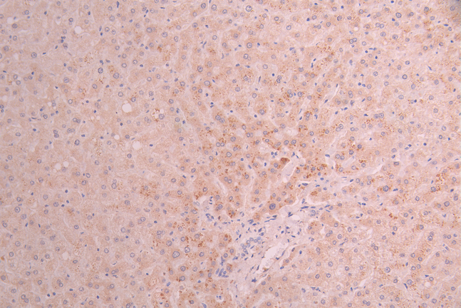 IHC image of CSB-RA017647MA3HU diluted at 1:50 and staining in paraffin-embedded human liver tissue performed on a Leica BondTM system. After dewaxing and hydration, antigen retrieval was mediated by high pressure in a citrate buffer (pH 6.0). Section was blocked with 10% normal goat serum 30min at RT. Then primary antibody (1% BSA) was incubated at 4°C overnight. The primary is detected by a Anti-Human lgG, Fcy Fragment Specific labeled by HRP and visualized using 0.05% DAB.