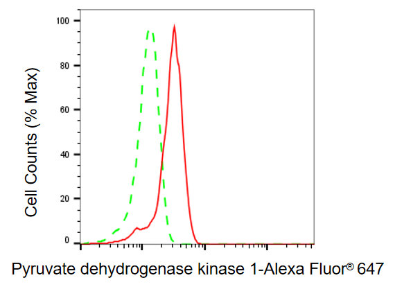 Flow cytometric analysis of pyruvate dehydrogenase kinase 1 expression in H9c2 cells using pyruvate dehydrogenase kinase 1 antibody. Green, isotype control; red, pyruvate dehydrogenase kinase 1.