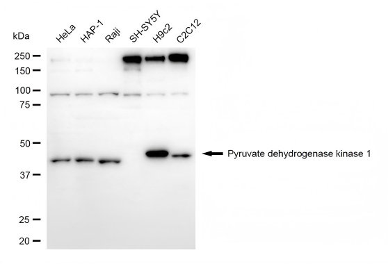 Western blotting analysis using pyruvate dehydrogenase kinase 1 antibody. Total cell lysates (30 μg) from various cell lines were loaded and separated by SDS-PAGE. The blot was incubated with pyruvate dehydrogenase kinase 1 antibody and HRP-conjugated goat anti-rabbit secondary antibody respectively.