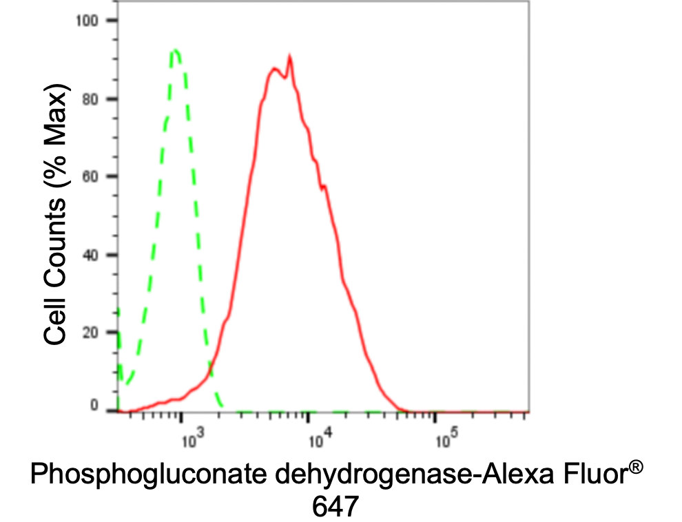 Flow cytometric analysis of phosphogluconate dehydrogenase expression in HepG2 cells using phosphogluconate dehydrogenase antibody. Green, isotype control; red, phosphogluconate dehydrogenase.