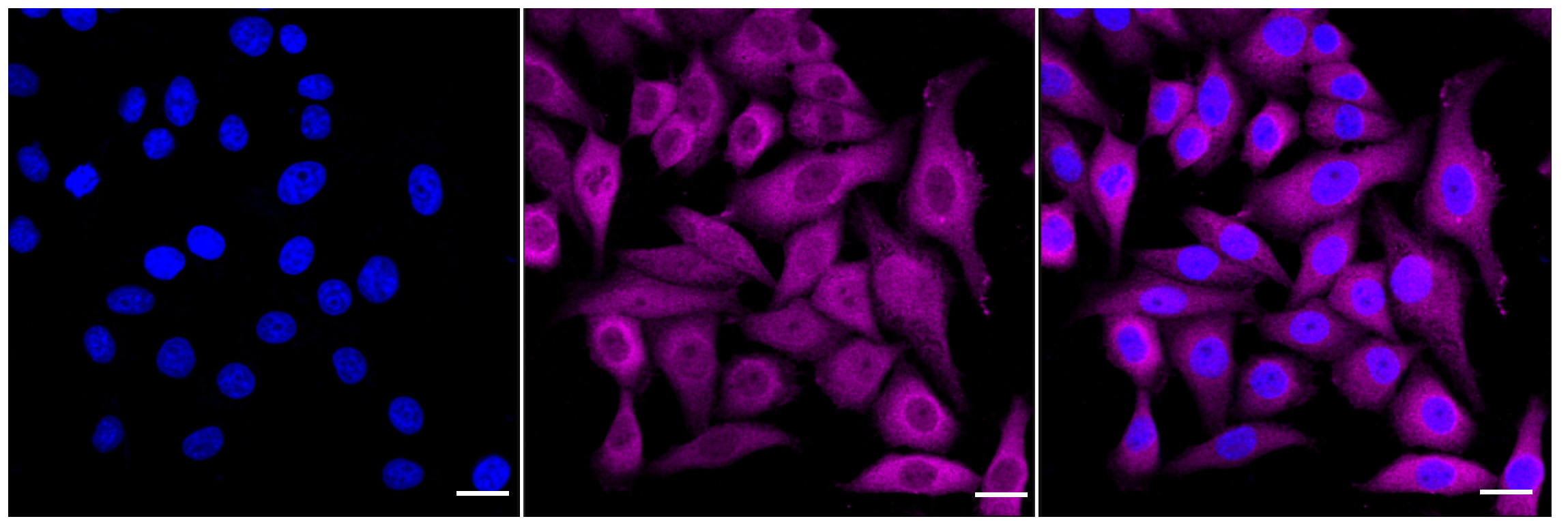 Immunocytochemical staining of HepG2 cells with Phosphogluconate dehydrogenase antibody. Nuclei were stained blue with DAPI; Phosphogluconate dehydrogenase?was stained magenta with Alexa Fluor? 647. Images were taken using Leica stellaris 5. Protein abundance based on laser Intensity and smart gain: High. Scale bar: 20 μm.
