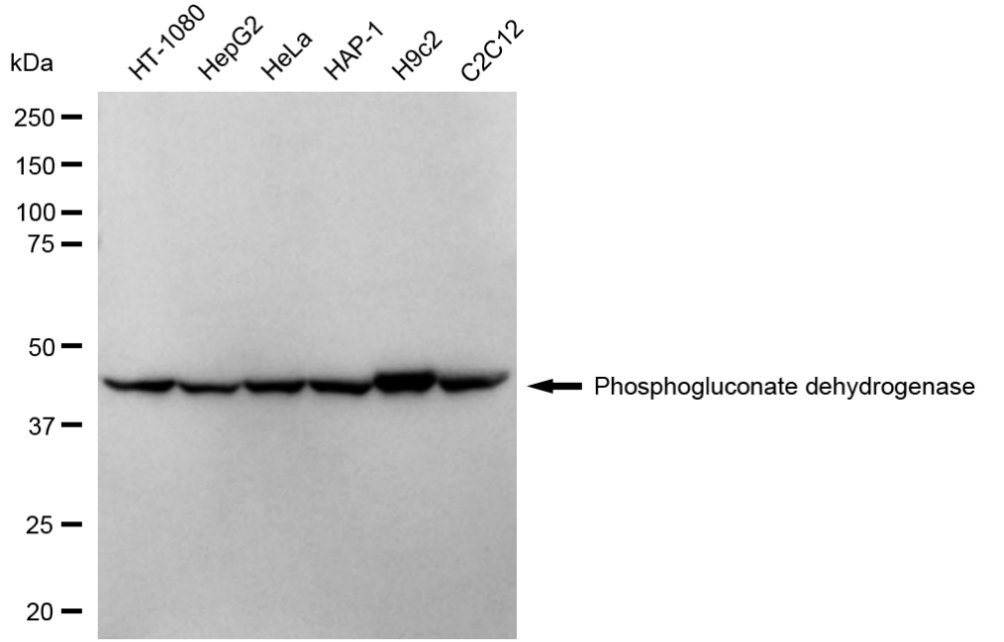 Western blotting analysis using phosphogluconate dehydrogenase antibody. Total cell lysates (30 μg) from various cell lines were loaded and separated by SDS-PAGE. The blot was incubated with phosphogluconate dehydrogenase antibody and HRP-conjugated goat anti-rabbit secondary antibody respectively.