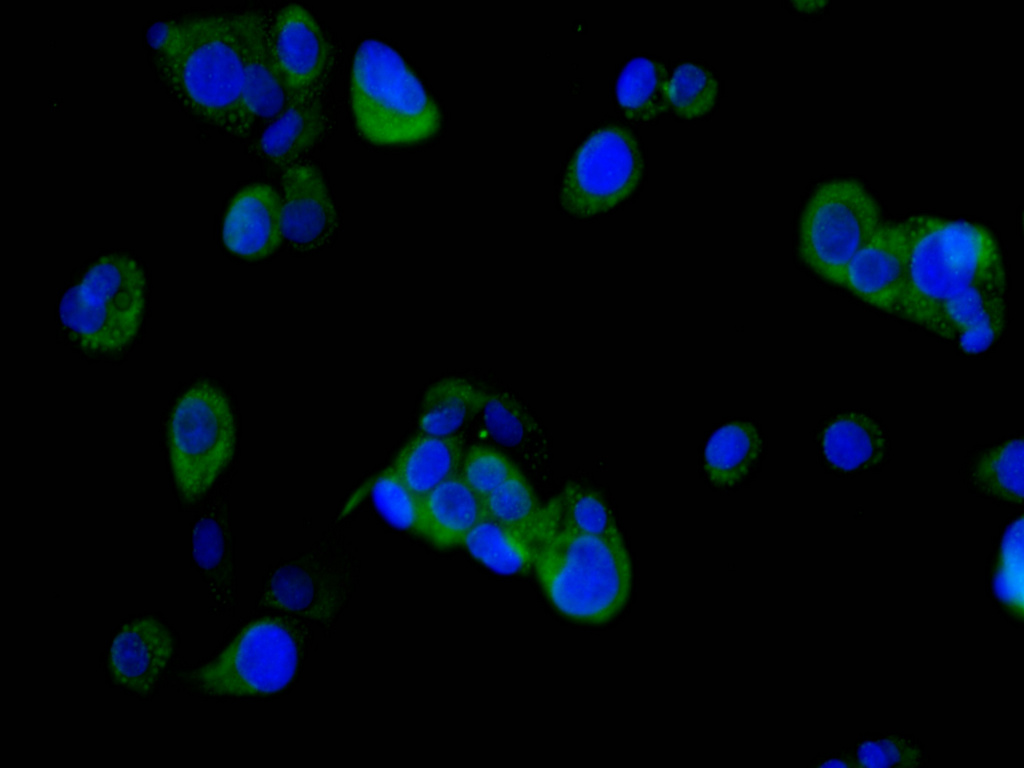 Immunofluorescence staining of HepG2 cell with CSB-RA212222A0HU at 1:50 , counter-stained with DAPI. The cells were fixed in 4% formaldehyde, permeabilized using 0.2% Triton X-100 and blocked in 10% normal Goat Serum. The cells were then incubated with the antibody overnight at 4°C. The secondary antibody was Alexa Fluor 488-congugated AffiniPure Goat Anti-Rabbit IgG(H+L).