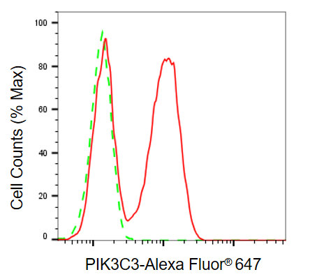 Flow cytometric analysis of PIK3C3 expression in HeLa cells using PIK3C3 antibody. Green, isotype control; red, PIK3C3.