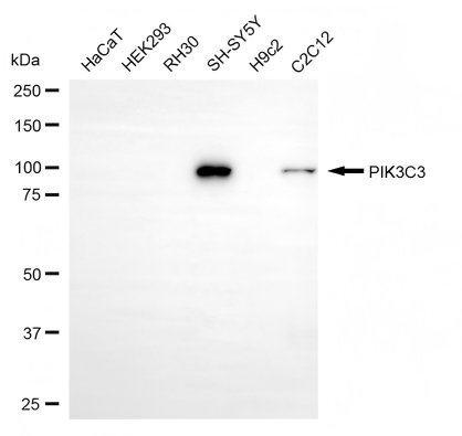 Western blotting analysis using PIK3C3 antibody. Total cell lysates (30 μg) from various cell lines were loaded and separated by SDS-PAGE. The blot was incubated with PIK3C3 antibody and HRP-conjugated goat anti-rabbit secondary antibody respectively.