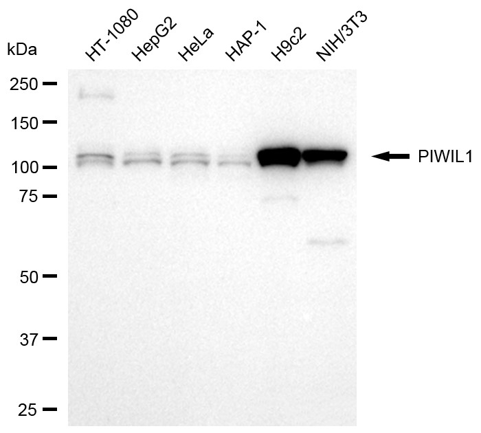 Western blotting analysis using PIWIL1 antibody. Total cell lysates (30 μg) from various cell lines were loaded and separated by SDS-PAGE. The blot was incubated with PIWIL1 antibody and HRP-conjugated goat anti-rabbit secondary antibody respectively.