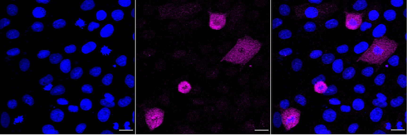 Immunocytochemical staining of H9c2 cells with Phospho-PLCB3 (S537) antibody. Nuclei were stained blue with DAPI; Phospho-PLCB3 (S537) was stained magenta with Alexa Fluor? 647. Images were taken using Leica stellaris 5. Protein abundance based on laser Intensity and smart gain: Medium. Scale bar, 20 μm.