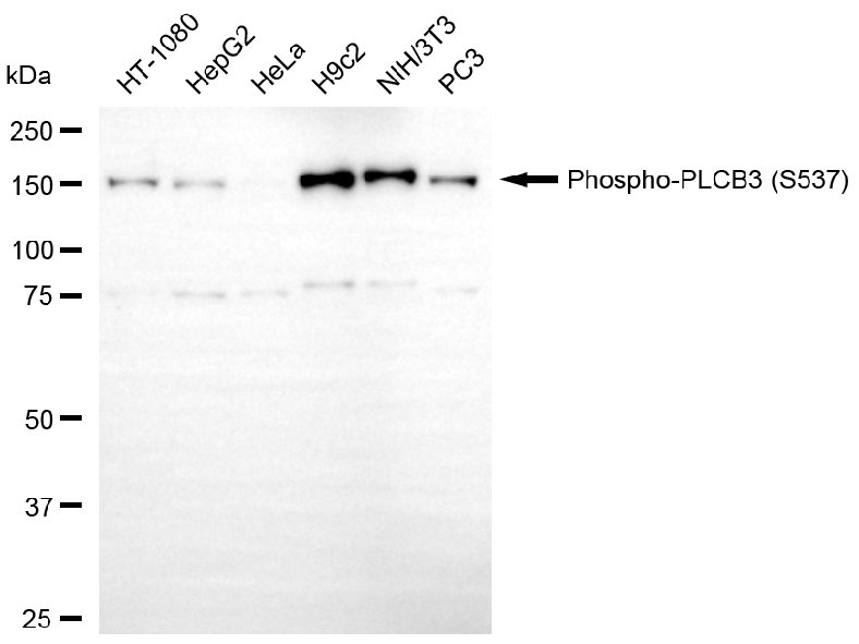 Western blotting analysis using phospho-PLCB3 (S537) antibody. Total cell lysates (30 μg) from various cell lines were loaded and separated by SDS-PAGE. The blot was incubated with phospho-PLCB3 (S537) antibody and HRP-conjugated goat anti-rabbit secondary antibody respectively.