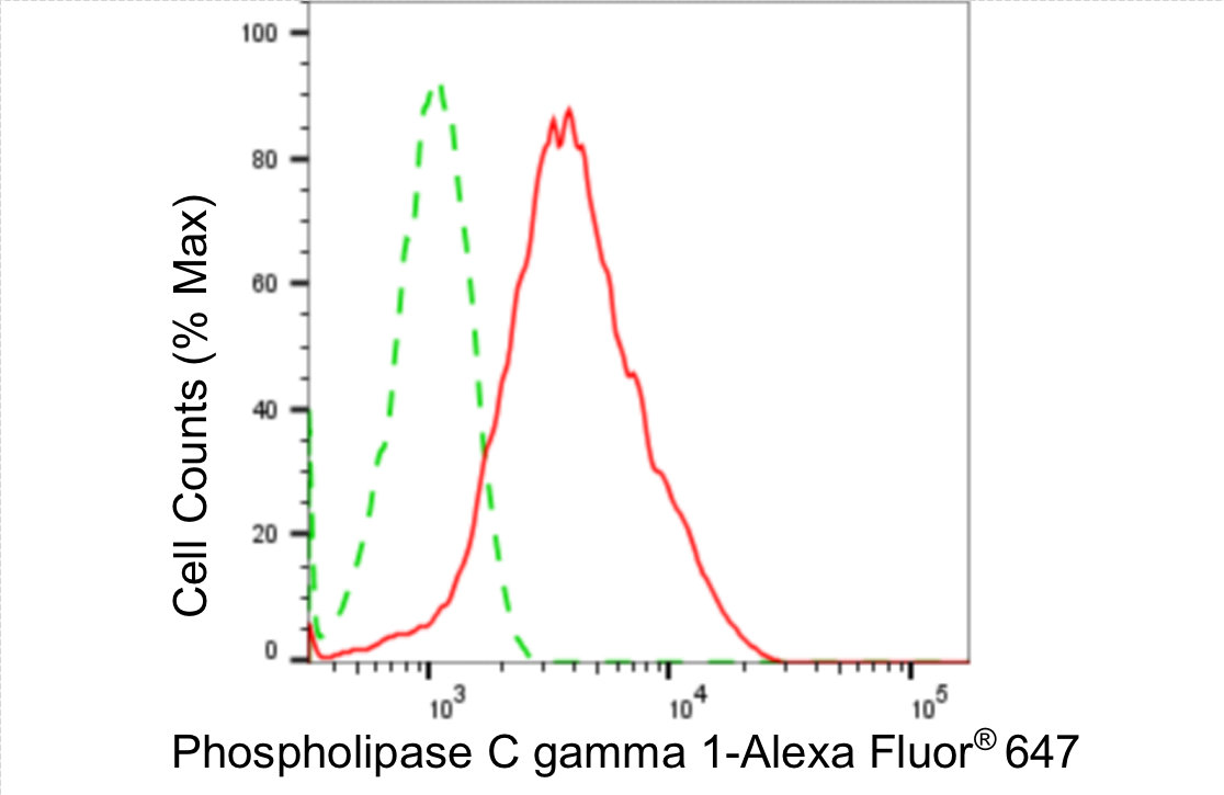 Flow cytometric analysis of phospholipase C gamma 1 expression in HepG2 cells using phospholipase C gamma 1 antibody. Green, isotype control; red, phospholipase C gamma 1.
