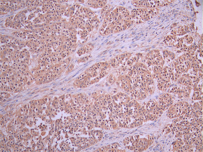 IHC image of CSB-RA028490A0HU diluted at 1:100 and staining in paraffin-embedded human liver cancer performed on a Leica BondTM system. After dewaxing and hydration, antigen retrieval was mediated by high pressure in a citrate buffer (pH 6.0). Section was blocked with 10% normal goat serum 30min at RT. Then primary antibody (1% BSA) was incubated at 4°C overnight. The primary is detected by a Goat anti-rabbit polymer IgG labeled by HRP and visualized using 0.05% DAB.