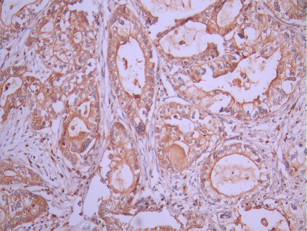 IHC image of CSB-RA632615A0HU diluted at 1:100 and staining in paraffin-embedded human pancreatic cancer performed on a Leica BondTM system. After dewaxing and hydration, antigen retrieval was mediated by high pressure in a citrate buffer (pH 6.0). Section was blocked with 10% normal goat serum 30min at RT. Then primary antibody (1% BSA) was incubated at 4°C overnight. The primary is detected by a Goat anti-rabbit polymer IgG labeled by HRP and visualized using 0.05% DAB.