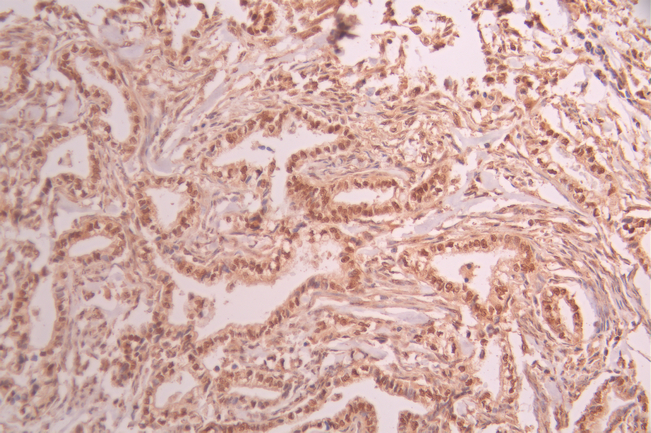 Immunofluorescence staining of A-549 cell with CSB-RA171352A0HU at 1:50, counter-stained with DAPI. The cells were fixed in 4% formaldehyde, permeabilized using 0.2% Triton X-100 and blocked in 10% normal Goat Serum. The cells were then incubated with the antibody overnight at 4°C. The secondary antibody was Alexa Fluor 488-congugated AffiniPure Goat Anti-Rabbit IgG(H+L).