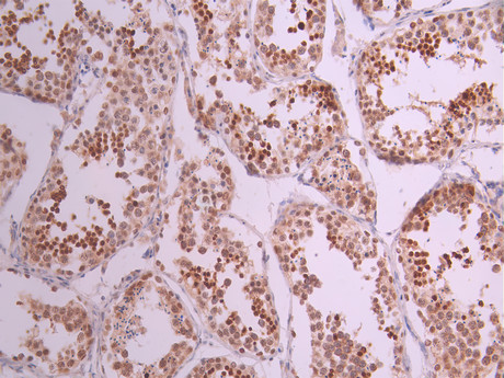 IHC image of CSB-RA185642A0HU diluted at 1:100 and staining in paraffin-embedded human testis tissue performed on a Leica BondTM system. After dewaxing and hydration, antigen retrieval was mediated by high pressure in a citrate buffer (pH 6.0). Section was blocked with 10% normal goat serum 30min at RT. Then primary antibody (1% BSA) was incubated at 4°C overnight. The primary is detected by a Goat anti-rabbit polymer IgG labeled by HRP and visualized using 0.05% DAB.
