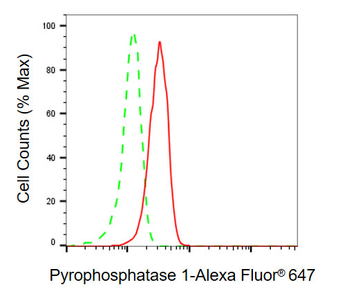 Flow cytometric analysis of pyrophosphatase 1 expression in HT-1080 cells using pyrophosphatase 1 antibody. Green, isotype control; red, pyrophosphatase 1.