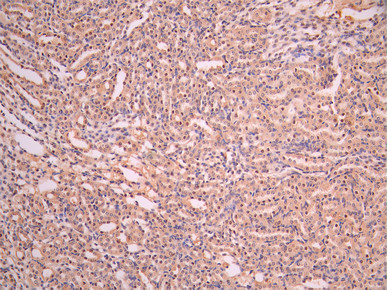 IHC image of CSB-RA790244A0HU diluted at 1:100 and staining in paraffin-embedded mouse kidney tissue performed on a Leica BondTM system. After dewaxing and hydration, antigen retrieval was mediated by high pressure in a citrate buffer (pH 6.0). Section was blocked with 10% normal goat serum 30min at RT. Then primary antibody (1% BSA) was incubated at 4°C overnight. The primary is detected by a Goat anti-rabbit polymer IgG labeled by HRP and visualized using 0.05% DAB.