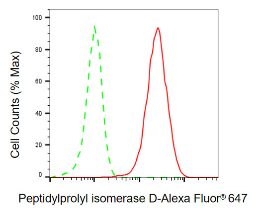 Flow cytometric analysis of peptidylprolyl isomerase D expression in HepG2 cells using peptidylprolyl isomerase D antibody. Green, isotype control; red, peptidylprolyl isomerase D.
