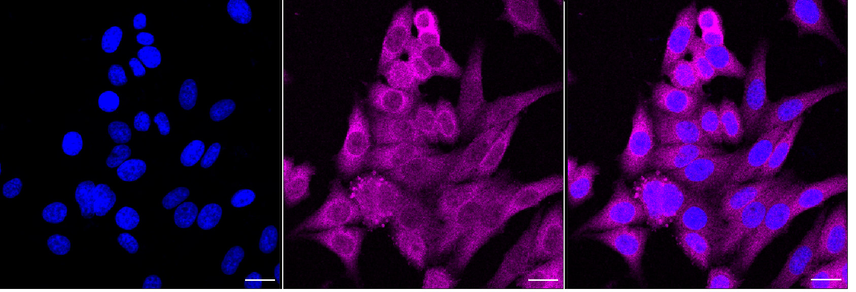 Immunocytochemical staining of HepG2 cells with peptidylprolyl isomerase D antibody. Nuclei were stained blue with DAPI; Peptidylprolyl isomerase D was stained magenta with Alexa Fluor? 647. Images were taken using Leica stellaris 5. Protein abundance based on laser Intensity and smart gain: Medium. Scale bar, 20 μm.