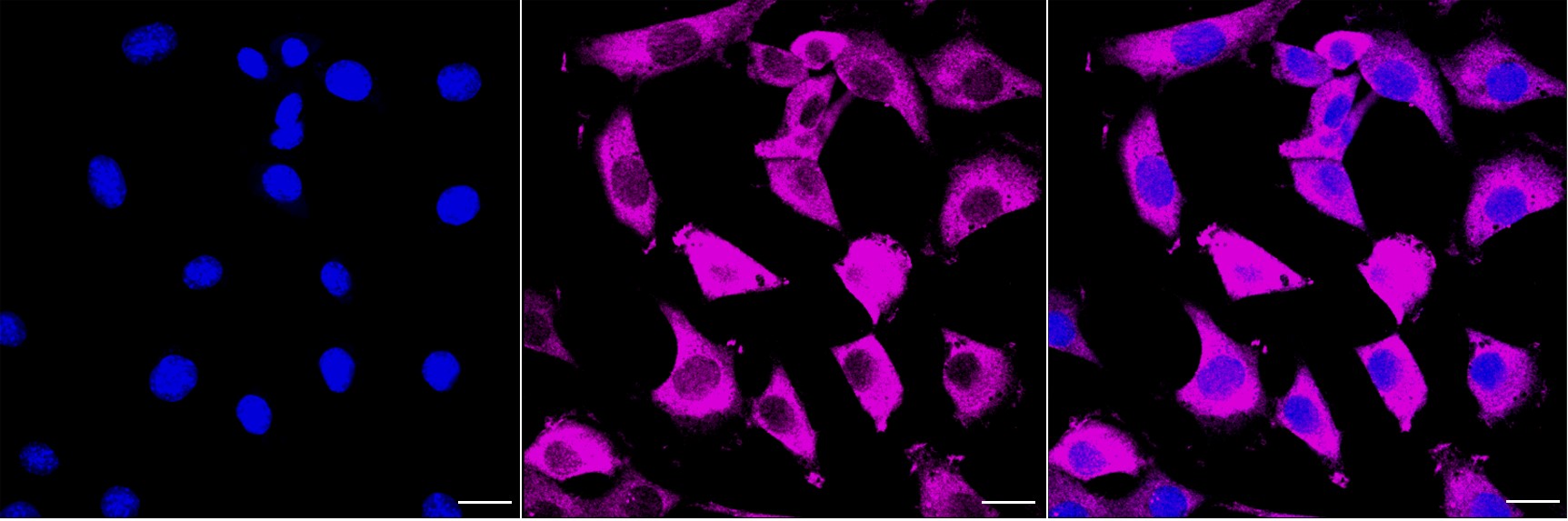 Immunocytochemical staining of C2C12 cells with Peptidylprolyl isomerase F antibody. Nuclei were stained blue with DAPI; Peptidylprolyl isomerase F was stained magenta with Alexa Fluor? 647. Images were taken using Leica stellaris 5. Protein abundance based on laser Intensity and smart gain: High. Scale bar, 20 μm.
