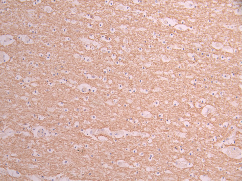 IHC image of CSB-RA201307A0HU diluted at 1:100 and staining in paraffin-embedded human brain tissue performed on a Leica BondTM system. After dewaxing and hydration, antigen retrieval was mediated by high pressure in a citrate buffer (pH 6.0). Section was blocked with 10% normal goat serum 30min at RT. Then primary antibody (1% BSA) was incubated at 4°C overnight. The primary is detected by a Goat anti-rabbit polymer IgG labeled by HRP and visualized using 0.05% DAB.