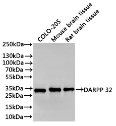 Positive WB detected in: COLO-205 whole cell lysate(30μg), Mouse brain tissue lysate(30μg), Rat brain tissue lysate(30μg)