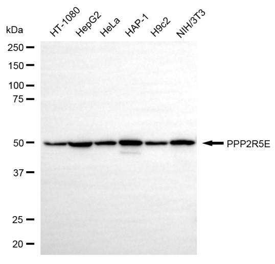 Western blotting analysis using PPP2R5E antibody. Total cell lysates (30 μg) from various cell lines were loaded and separated by SDS-PAGE. The blot was incubated with PPP2R5E antibody and HRP-conjugated goat anti-rabbit secondary antibody respectively.