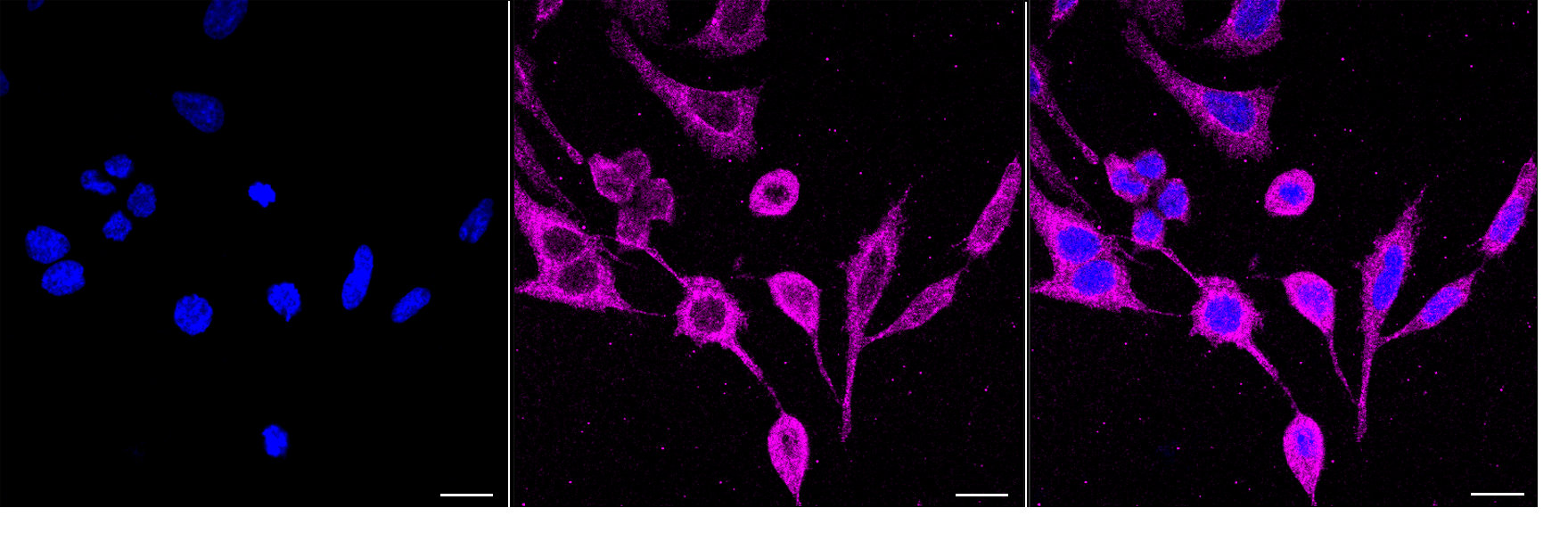 Immunocytochemical staining of HeLa cells with PPP3CA antibody. Nuclei were stained blue with DAPI; PPP3CA was stained magenta with Alexa Fluor? 647. Images were taken using Leica stellaris 5. Protein abundance based on laser Intensity and smart gain: Medium. Scale bar, 20 μm.