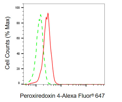 Flow cytometric analysis of peroxiredoxin 4 expression in HAP-1 cells using peroxiredoxin 4 antibody. Green, isotype control; red, peroxiredoxin 4.