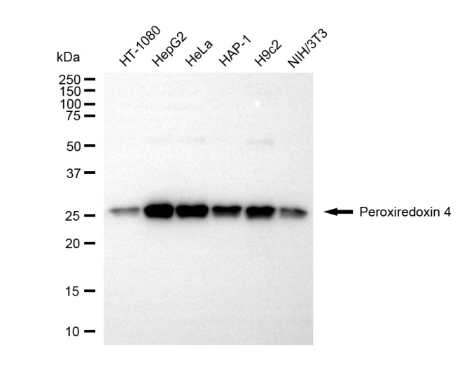 Western blotting analysis using peroxiredoxin 4 antibody. Total cell lysates (30 μg) from various cell lines were loaded and separated by SDS-PAGE. The blot was incubated with peroxiredoxin 4 antibody and HRP-conjugated goat anti-rabbit secondary antibody respectively.