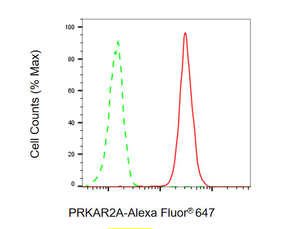 Flow cytometric analysis of PRKAR2A expression in HAP-1 cells using PRKAR2A antibody. Green, isotype control; red, PRKAR2A.