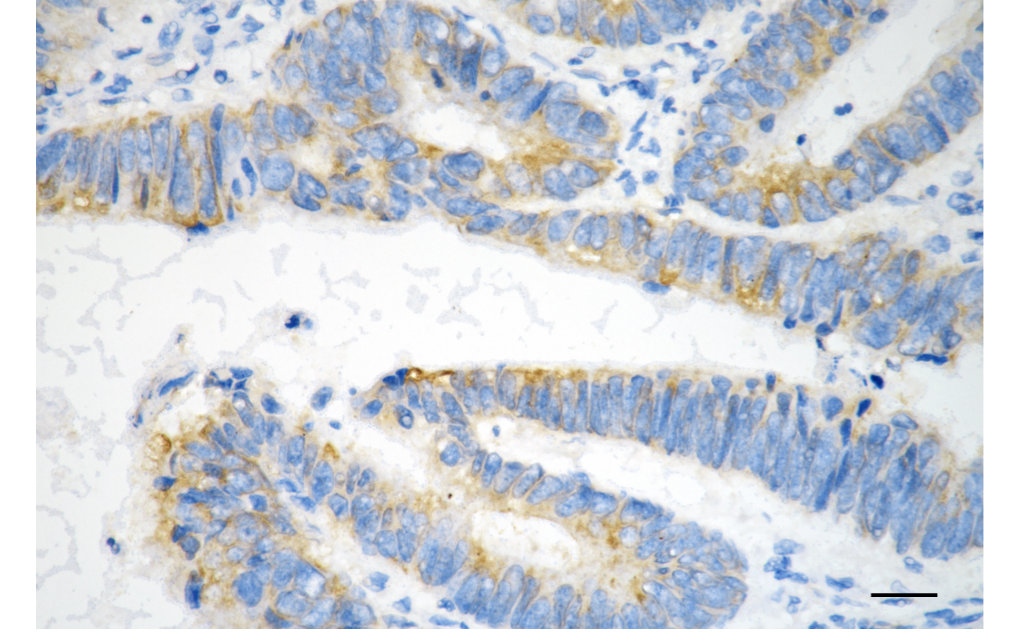 Immunohistochemistry was performed on paraffin-embedded human sigmoid colon carcinoma using PRKAR2A antibody. Antigen retrieval was done in sodium citrate buffer (pH 6.0). DAB was used for detection, with hematoxylin counterstaining. Images were acquired using a Nikon Ci-L Plus microscope (40× objective). Scale bar: 25 μm.