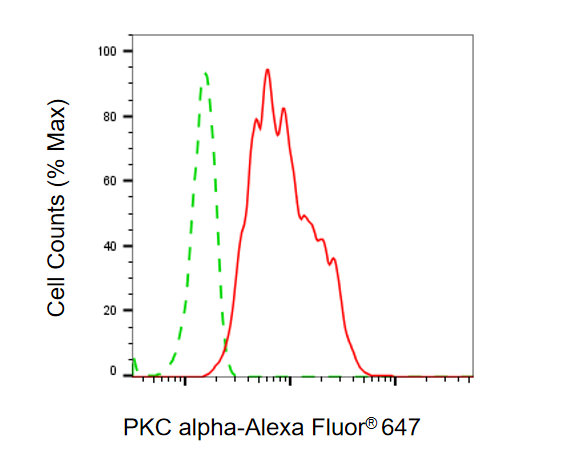 Flow cytometric analysis of PKC alpha expression in HT-1080 cells using PKC alpha antibody. Green, isotype control; red, PKC alpha.