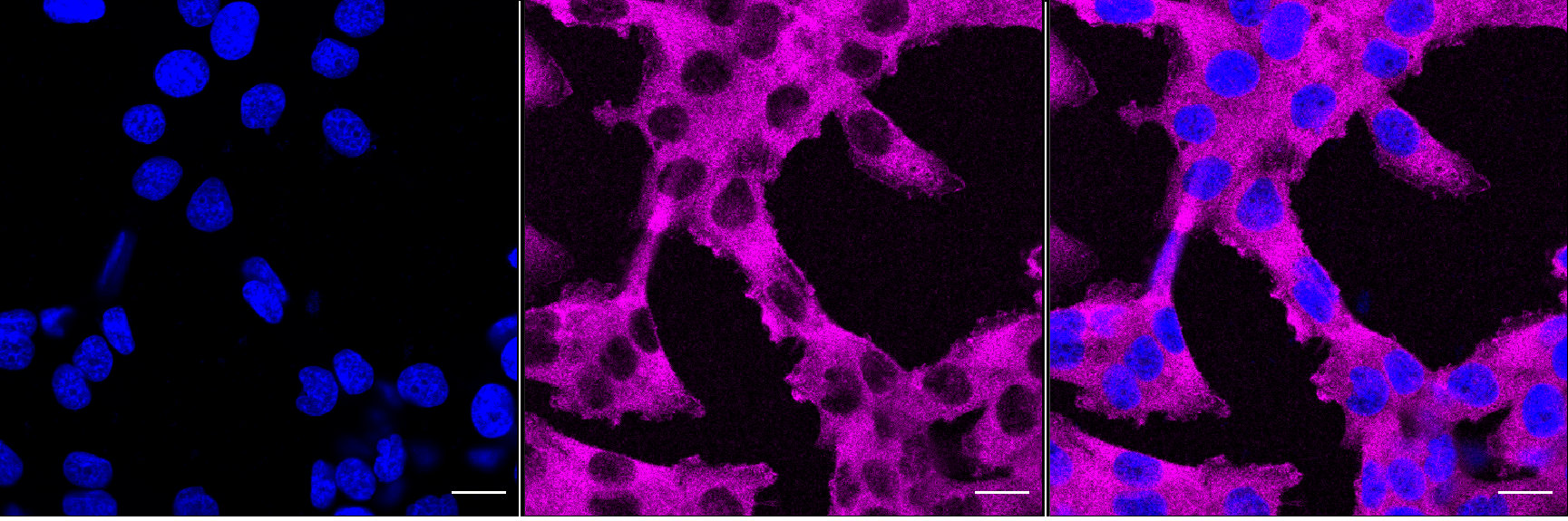 Immunocytochemical staining of HT-1080 cells with PKC alpha antibody. Nuclei were stained blue with DAPI; PKC alpha was stained magenta with Alexa Fluor? 647. Images were taken using Leica stellaris 5. Protein abundance based on laser Intensity and smart gain: Medium. Scale bar, 20 μm.