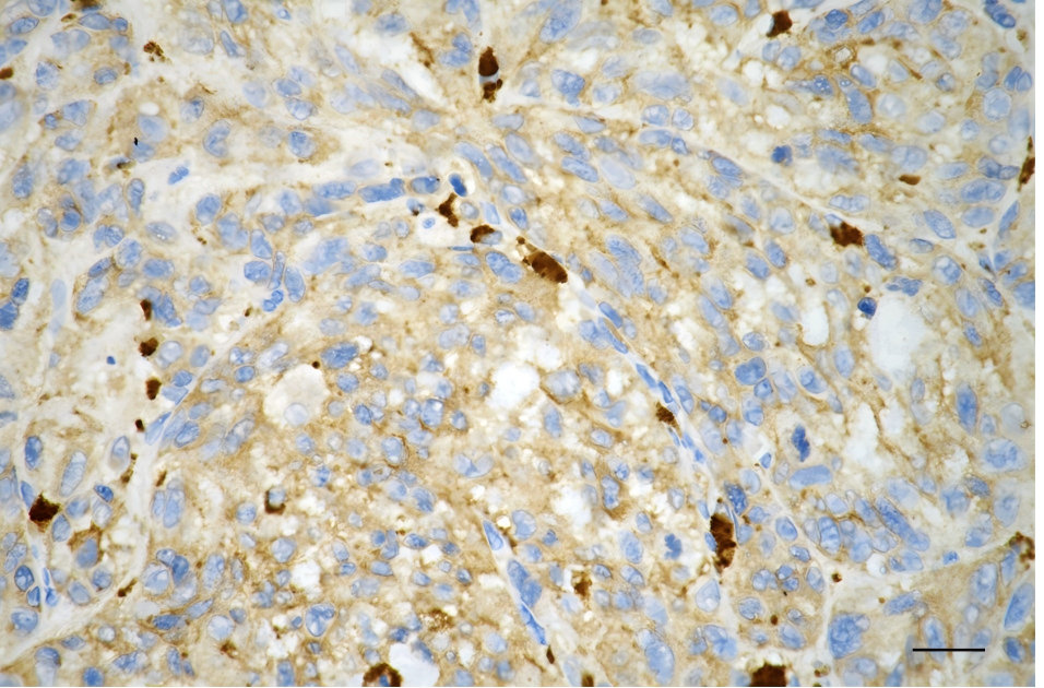 Immunohistochemistry was performed on paraffin-embedded human glioblastoma using PKC alpha antibody. Antigen retrieval was done in sodium citrate buffer (pH 6.0). DAB was used for detection, with hematoxylin counterstaining. Images were acquired using a Nikon Ci-L Plus microscope (40× objective). Scale bar: 25 μm.