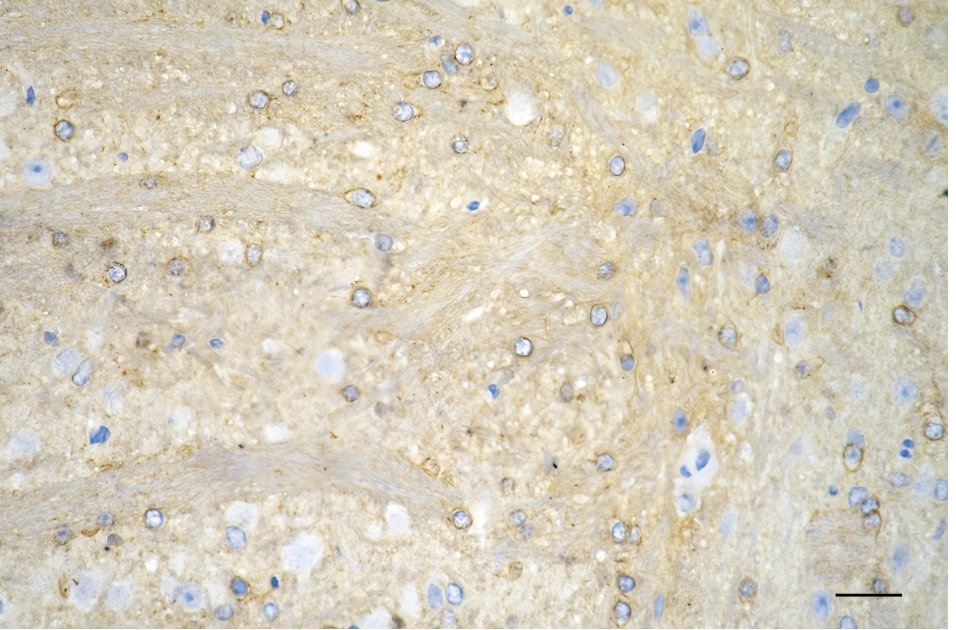 Immunohistochemistry was performed on paraffin-embedded mouse brain using PKC alpha antibody. Antigen retrieval was done in sodium citrate buffer (pH 6.0). DAB was used for detection, with hematoxylin counterstaining. Images were acquired using a Nikon Ci-L Plus microscope (40× objective). Scale bar: 25 μm.