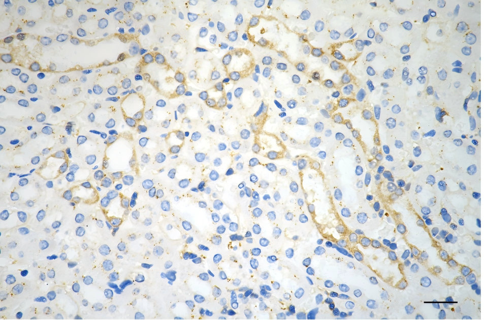 Immunohistochemistry was performed on paraffin-embedded mouse kidney using PKC alpha antibody. Antigen retrieval was done in sodium citrate buffer (pH 6.0). DAB was used for detection, with hematoxylin counterstaining. Images were acquired using a Nikon Ci-L Plus microscope (40× objective). Scale bar: 25 μm.