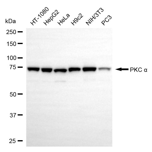 Western blotting analysis using PKC alpha antibody. Total cell lysates (30 μg) from various cell lines were loaded and separated by SDS-PAGE. The blot was incubated with PKC alpha antibody and HRP-conjugated goat anti-rabbit secondary antibody respectively.