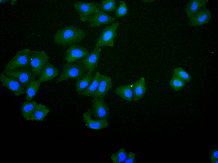 Immunofluorescence staining of HeLa cell with CSB-RA057607A0HU at 1:50 , counter-stained with DAPI. The cells were fixed in 4% formaldehyde, permeabilized using 0.2% Triton X-100 and blocked in 10% normal Goat Serum. The cells were then incubated with the antibody overnight at 4°C. The secondary antibody was Alexa Fluor 488-congugated AffiniPure Goat Anti-Rabbit IgG(H+L).