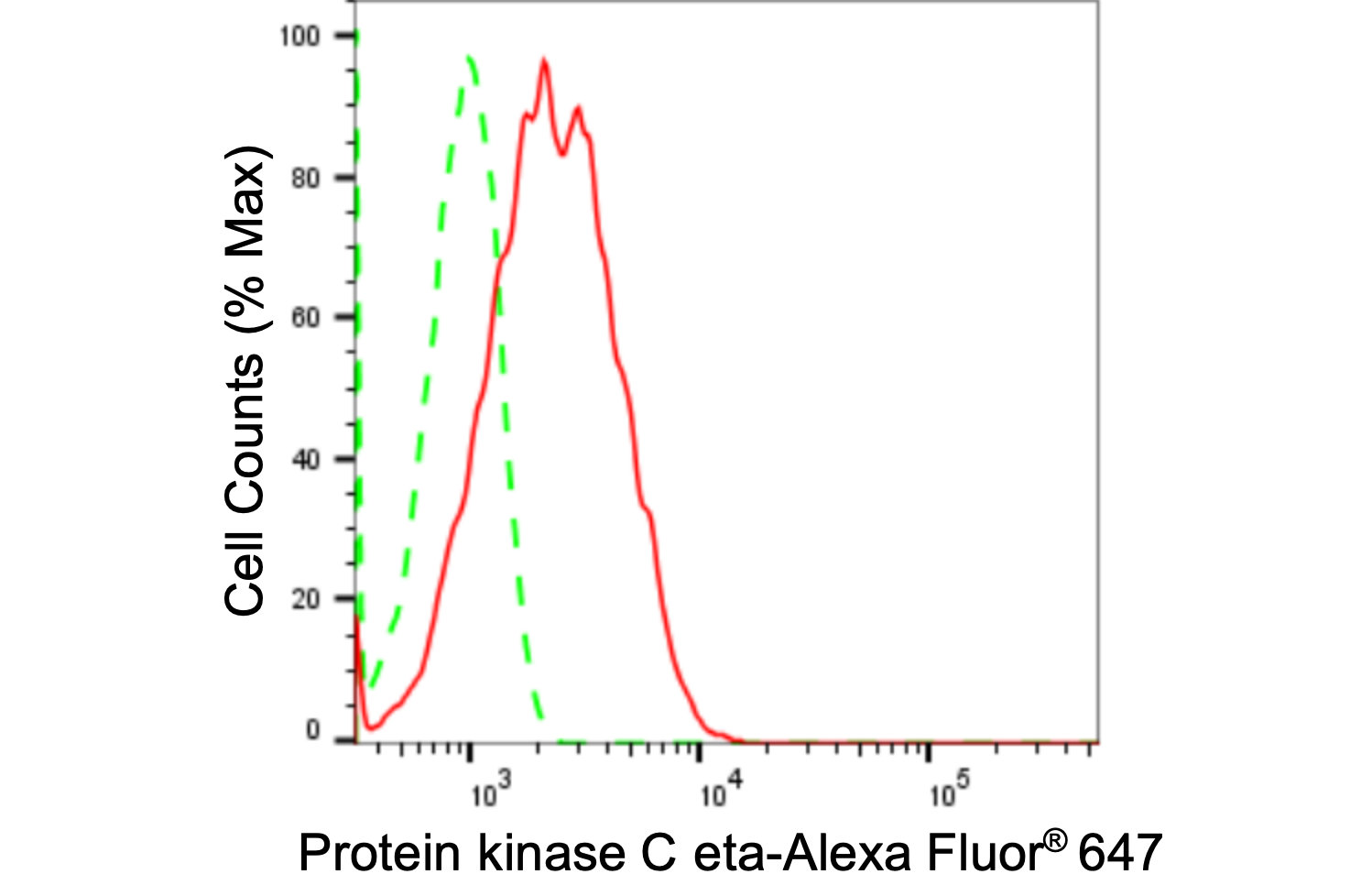 Flow cytometric analysis of Protein kinase C eta expression in HepG2 cells using Protein kinase C eta antibody. Green, isotype control; red, Protein kinase C eta.