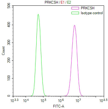 Overlay Peak curve showing 786-O cells stained with CSB-RA439154A0HU (red line) at 1:100. The cells were fixed in 4% formaldehyde and permeated by 0.2% TritonX-100 for 10min. Then 10% normal goat serum to block non-specific protein-protein interactions followed by the antibody (1ug/1*106cells) for 45min at 4℃. The secondary antibody used was FITC-conjugated goat anti-rabbit IgG (H+L) at 1/200 dilution for 35min at 4℃.Control antibody (green line) was Rabbit IgG (1ug/1*106cells) used under the same conditions. Acquisition of >10, 000 events was performed.