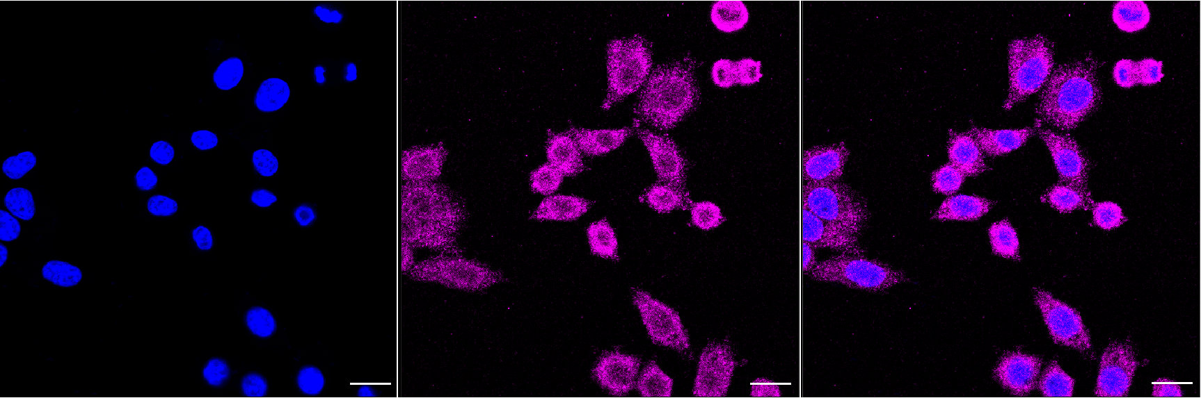 Immunocytochemical staining of HepG2 cells with PRKRA antibody. Nuclei were stained blue with DAPI; PRKRA was stained magenta with Alexa Fluor? 647. Images were taken using Leica stellaris 5. Protein abundance based on laser Intensity and smart gain: Medium. Scale bar, 20 μm.
