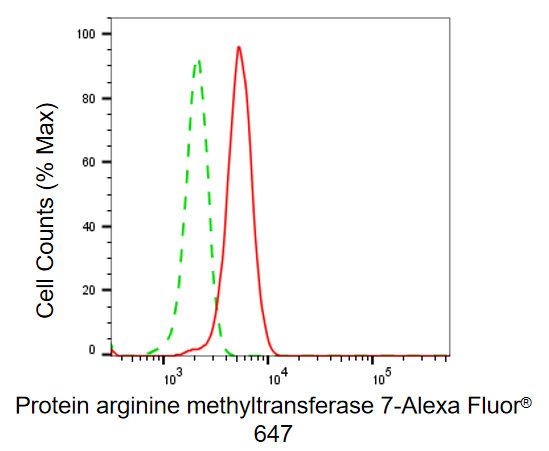 Flow cytometric analysis of protein arginine methyltransferase 7 expression in HepG2 cells using protein arginine methyltransferase 7 antibody. Green, isotype control; red, protein arginine methyltransferase 7.