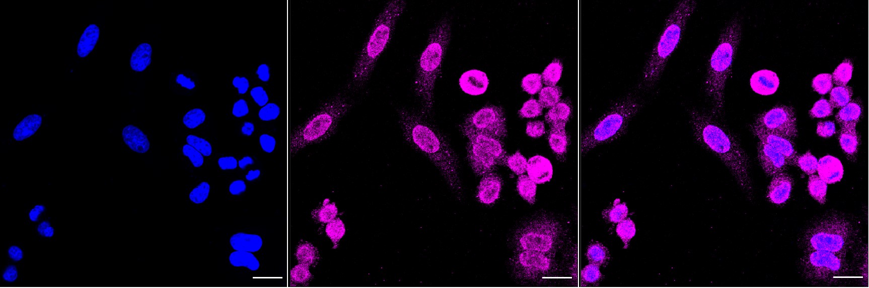 Immunocytochemical staining of HepG2 cells with Protein arginine methyltransferase 7 antibody. Nuclei were stained blue with DAPI; Protein arginine methyltransferase 7 was stained magenta with Alexa Fluor? 647. Images were taken using Leica stellaris 5. Protein abundance based on laser Intensity and smart gain: Medium. Scale bar, 20 μm.
