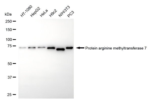 Western blotting analysis using protein arginine methyltransferase 7 antibody. Total cell lysates (30 μg) from various cell lines were loaded and separated by SDS-PAGE. The blot was incubated with protein arginine methyltransferase 7 antibody and HRP-conjugated goat anti-rabbit secondary antibody respectively.