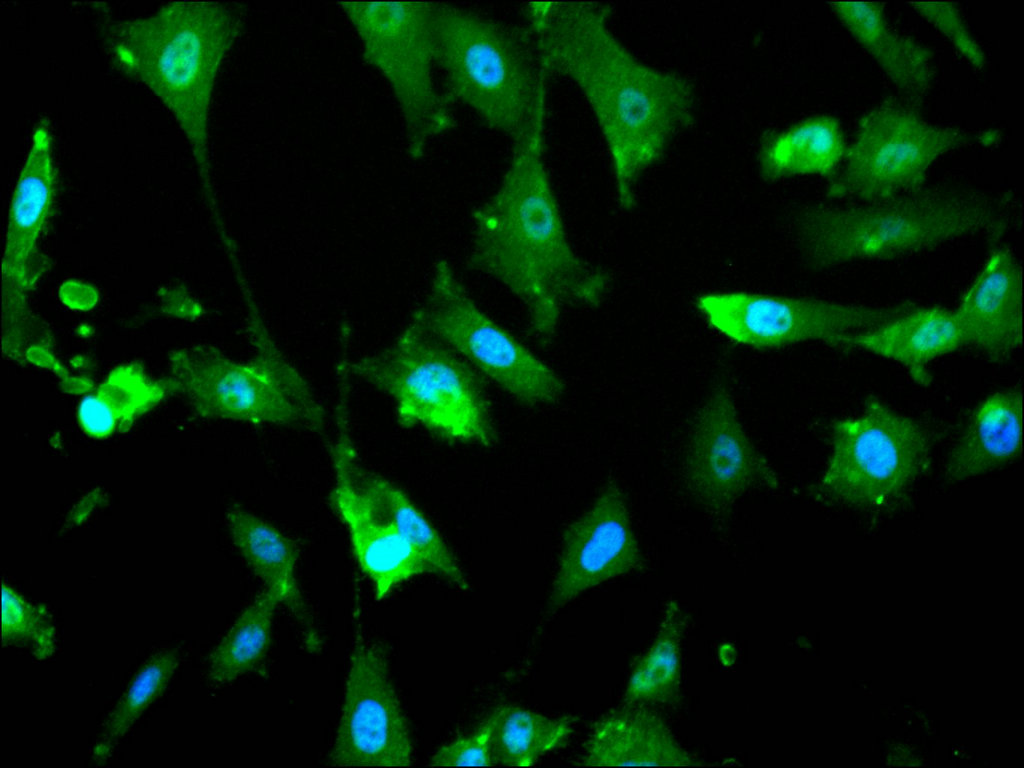 Immunofluorescence staining of PC-3 cell with CSB-RA904109A0HU at 1:50, counter-stained with DAPI. The cells were fixed in 4% formaldehyde, permeabilized using 0.2% Triton X-100 and blocked in 10% normal Goat Serum. The cells were then incubated with the antibody overnight at 4°C. The secondary antibody was Alexa Fluor 488-congugated AffiniPure Goat Anti-Rabbit IgG(H+L).
