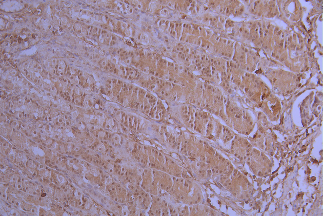 IHC image of CSB-RA998693A0HU diluted at 1:100 and staining in paraffin-embedded human gastric cancer performed on a Leica BondTM system. After dewaxing and hydration, antigen retrieval was mediated by high pressure in a citrate buffer (pH 6.0). Section was blocked with 10% normal goat serum 30min at RT. Then primary antibody (1% BSA) was incubated at 4°C overnight. The primary is detected by a Goat anti-rabbit polymer IgG labeled by HRP and visualized using 0.05% DAB.