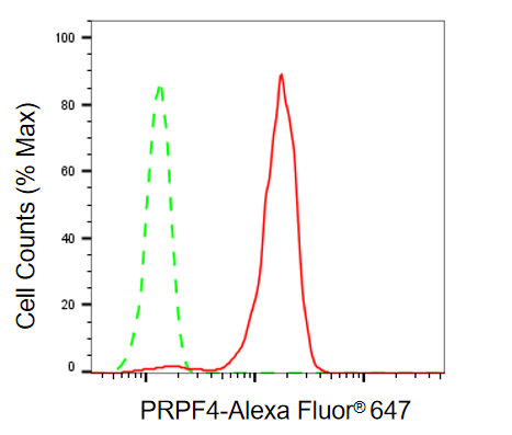 Flow cytometric analysis of PRPF4 expression in HepG2 cells using PRPF4 antibody. Green, isotype control; red, PRPF4.
