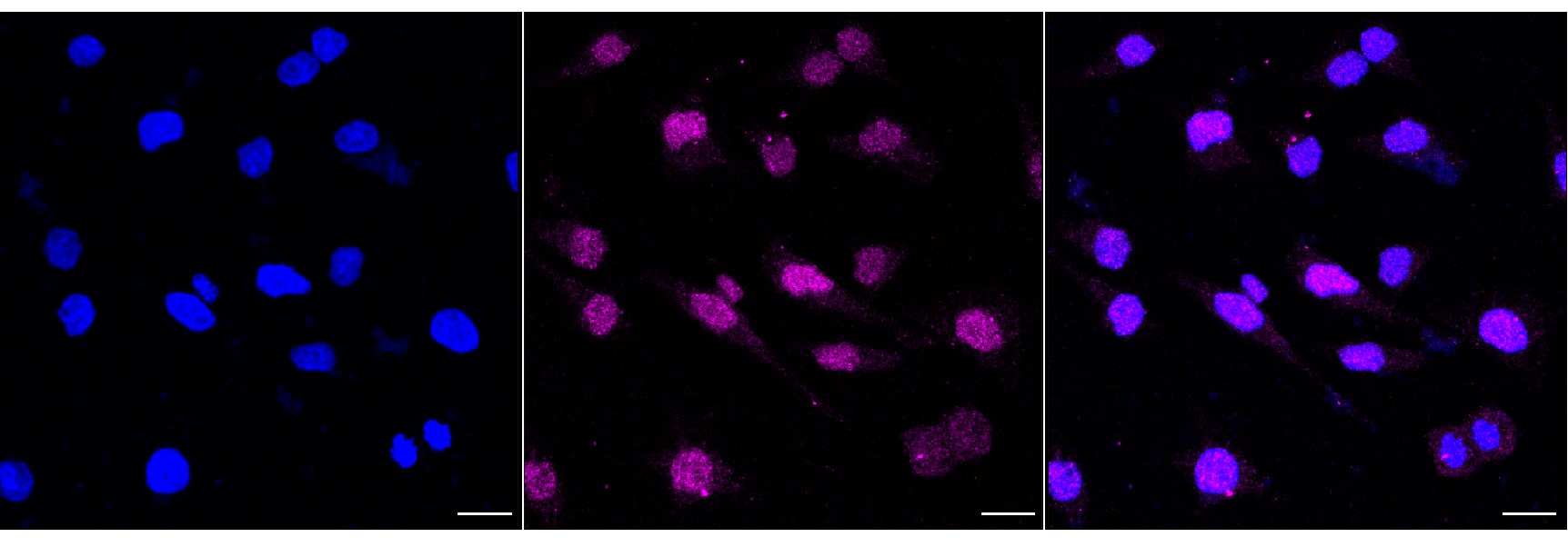 Immunocytochemical staining of Hela cells with PSIP1 antibody. Nuclei were stained blue with DAPI; PSIP1 was stained magenta with Alexa Fluor? 647. Images were taken using Leica stellaris 5. Protein abundance based on laser Intensity and smart gain: Medium. Scale bar, 20 μm.