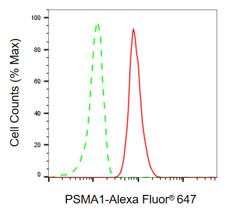 Flow cytometric analysis of PSMA1 expression in HT-1080 cells using PSMA1 antibody. Green, isotype control; red, PSMA1.